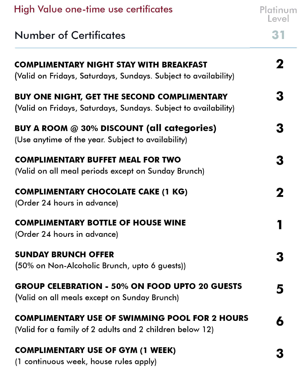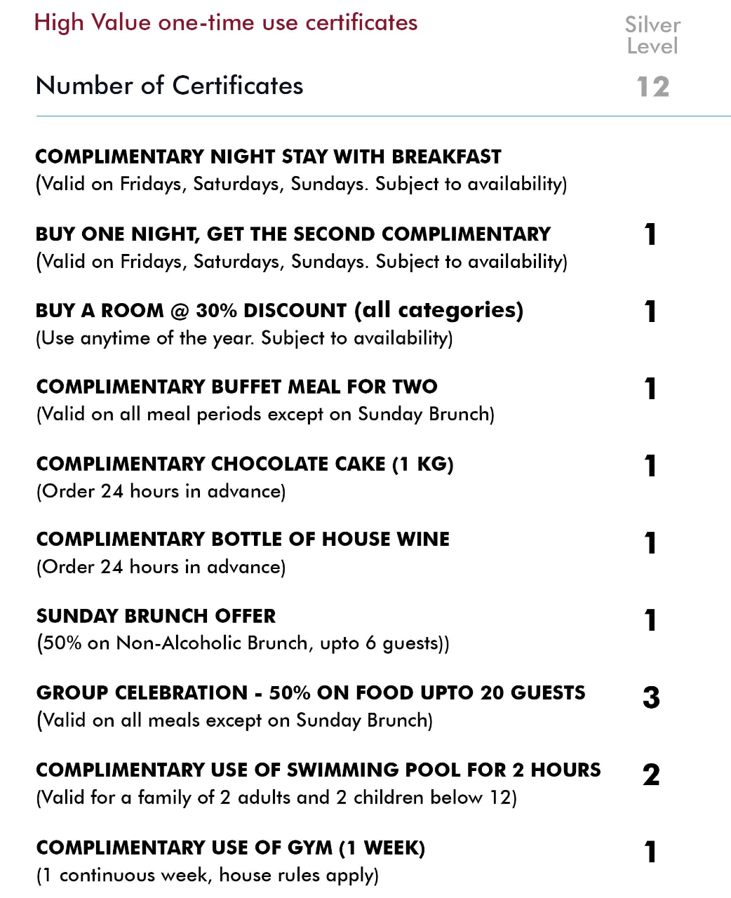 - Group Celebration : Two certificates offering a 30% discount on the food bill and 20% discount on the beverage bill for upto 10 guests from Monday to Friday.